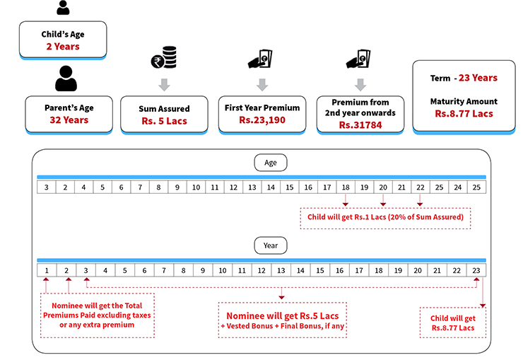 • This plan offers the guaranteed 20% of Sum Assured to the child on the completion of ages 18, 20 & 22 Years