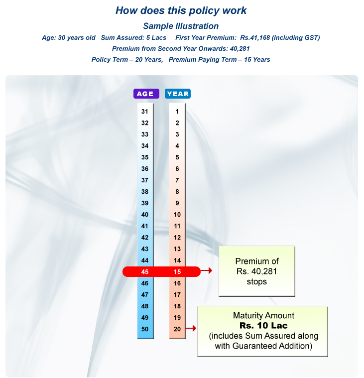 • The customer gets the tax-free maturity under this plan which includes the guaranteed addition along with Sum Assured