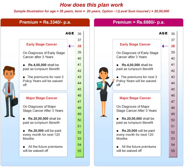 Premium Waiver Benefit: All the Future premiums will be waived off on the diagnosis of specified Major Stage Cancer.